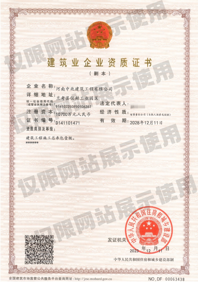 • 河南中兆建筑工程有限公司成立于2013年,公司注冊資本10700萬元,凈資產總額近1.9億元。公司目前具有“建筑工程、市政公用工程、鋼結構工程、建筑機電安裝工程、建筑裝修裝飾工程、地基與基礎工程、消防設施工程、壓力管道”等17個資質。現有從業人員2150人,具有中高級各類專業技術職稱管理人員達120人,壹級、貳級建造師約90余人;主要施工設備300多臺(套)。通過了ISO9001質量管理體系認證、職業健康安全管理體系認證、環境管理體系認證,并多次獲得省級“AAA”信用企業、“重合同守信用”、“先進建筑企業...